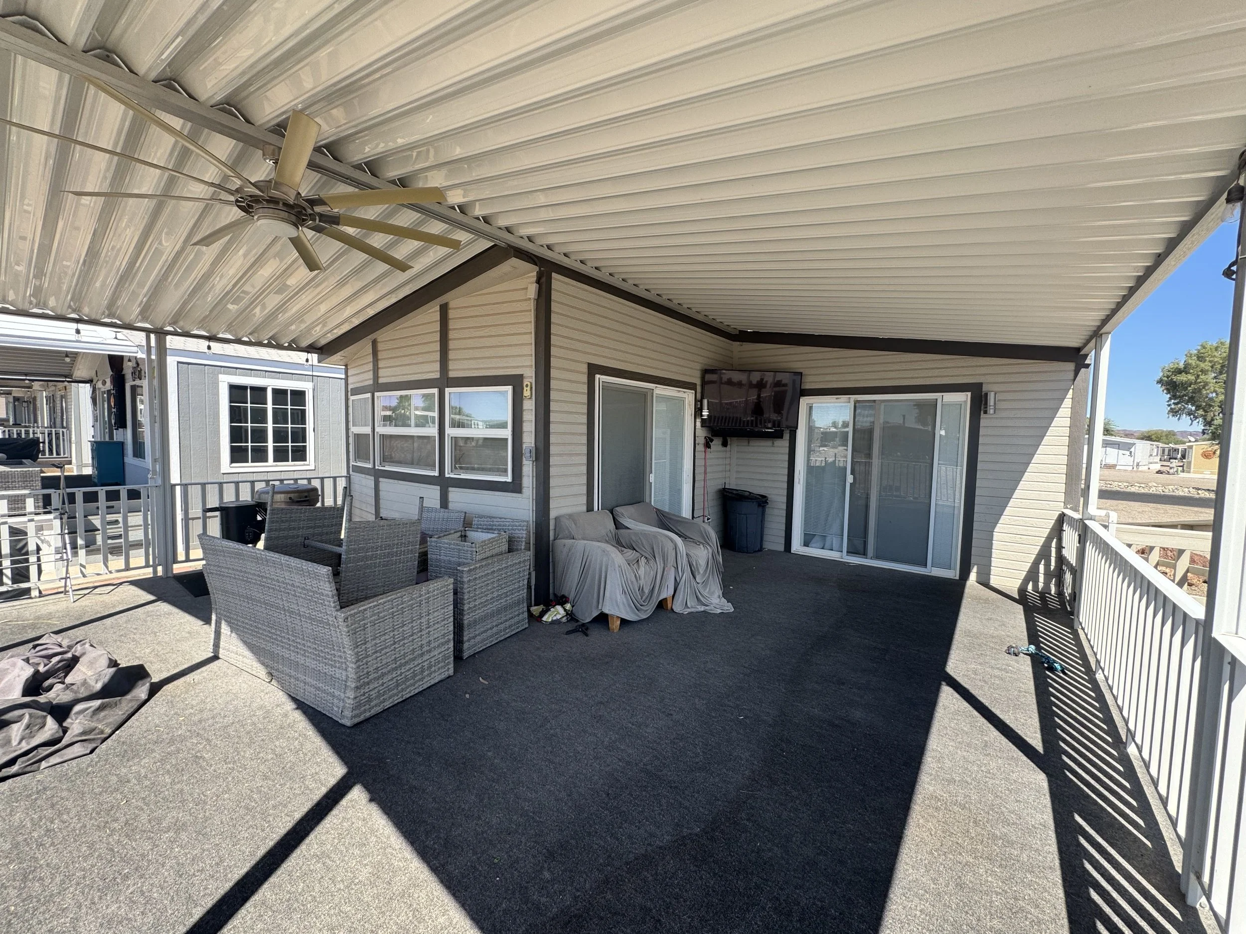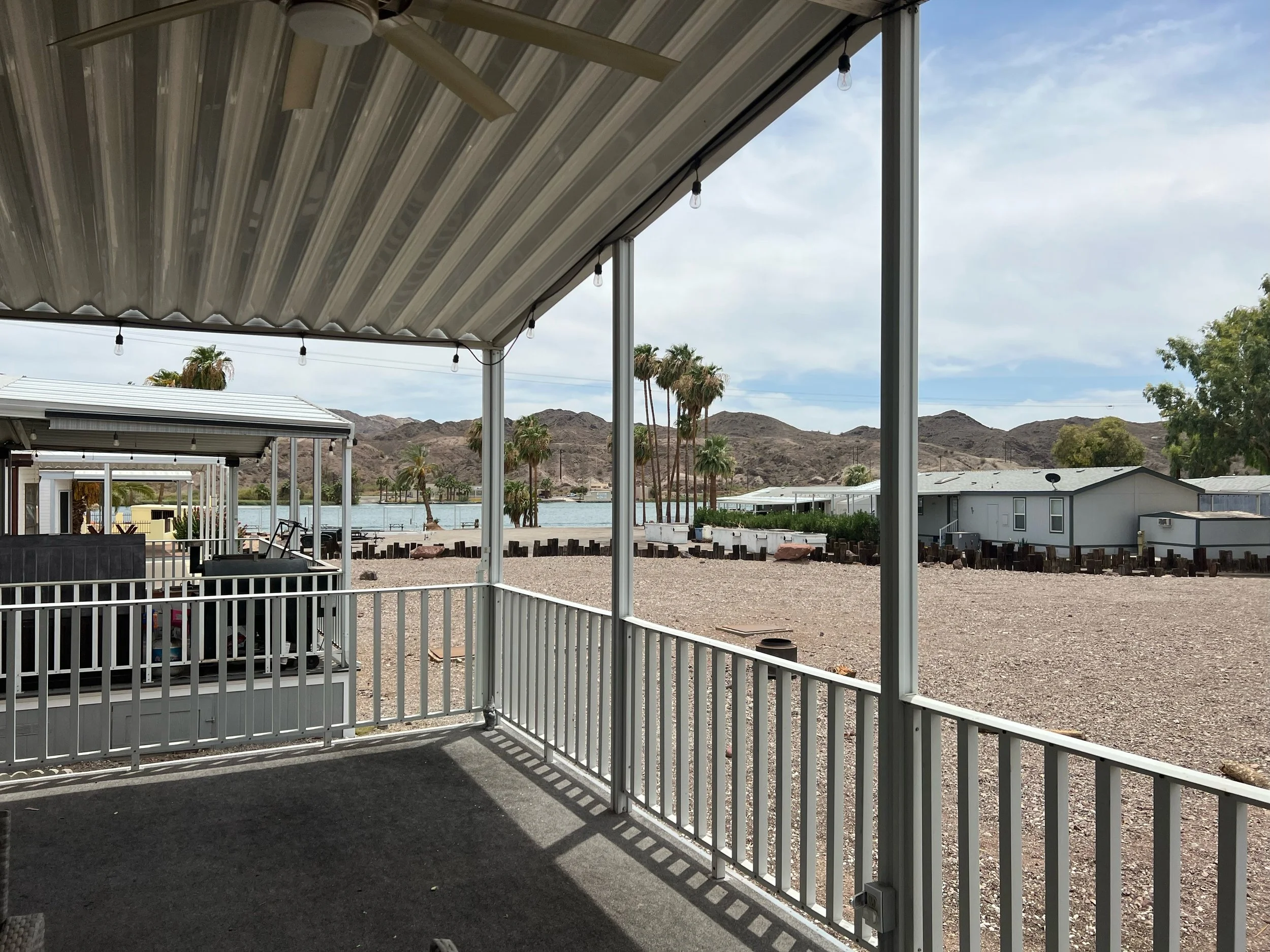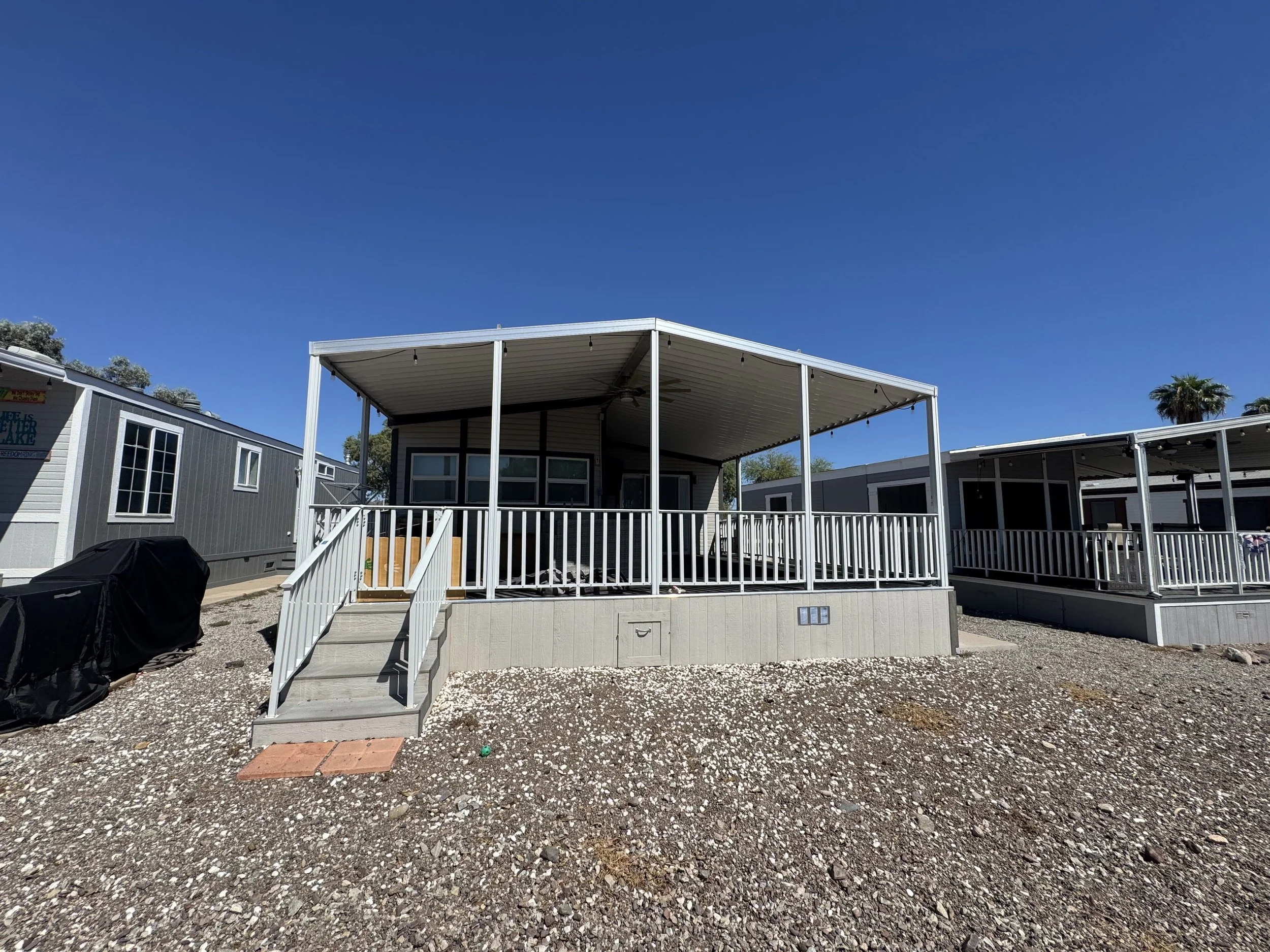 This 2-bedroom 1-bathroom mobile home has been recently remodeled and is beautiful! This home has a great river view, a central location near the pool, and a large covered porch. Recent upgrades include: new cabinetry, new windows, laminate flooring, stainless steel appliances, solid-surface quartz countertops, etc. One large “bunk-style” bedroom with plenty of room, and another queen-sized bedroom. The shed features a stackable laundry (included) and a water softener. This home comes turnkey and fully furnished.